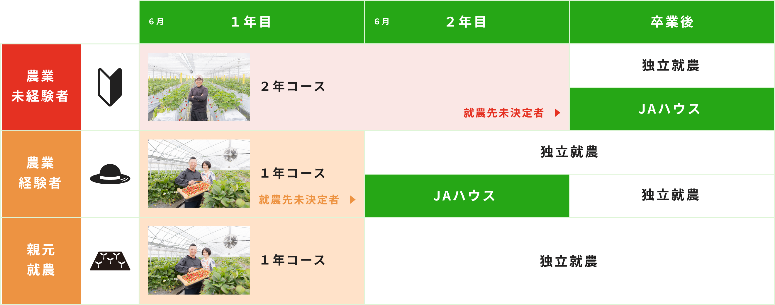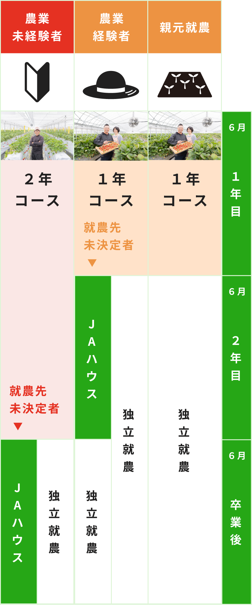 2年コース農業未経験者、1年コース農業経験者、農業研修修了者、親元就農予定者(紀の川市内)の2コースがあり、研修修了時に農地が見つからなかった場合、見つかるまでの間、JAの研修ハウスで働くことが可能です。