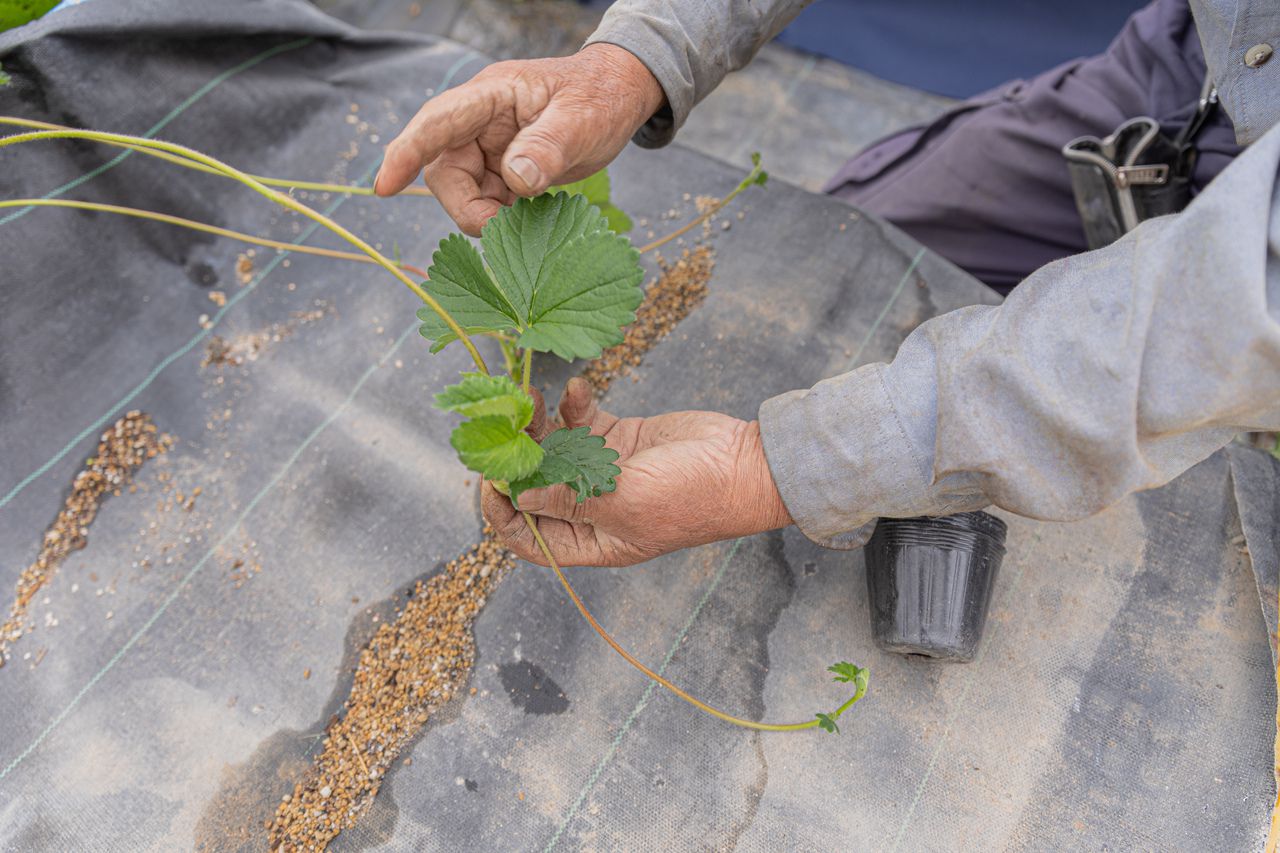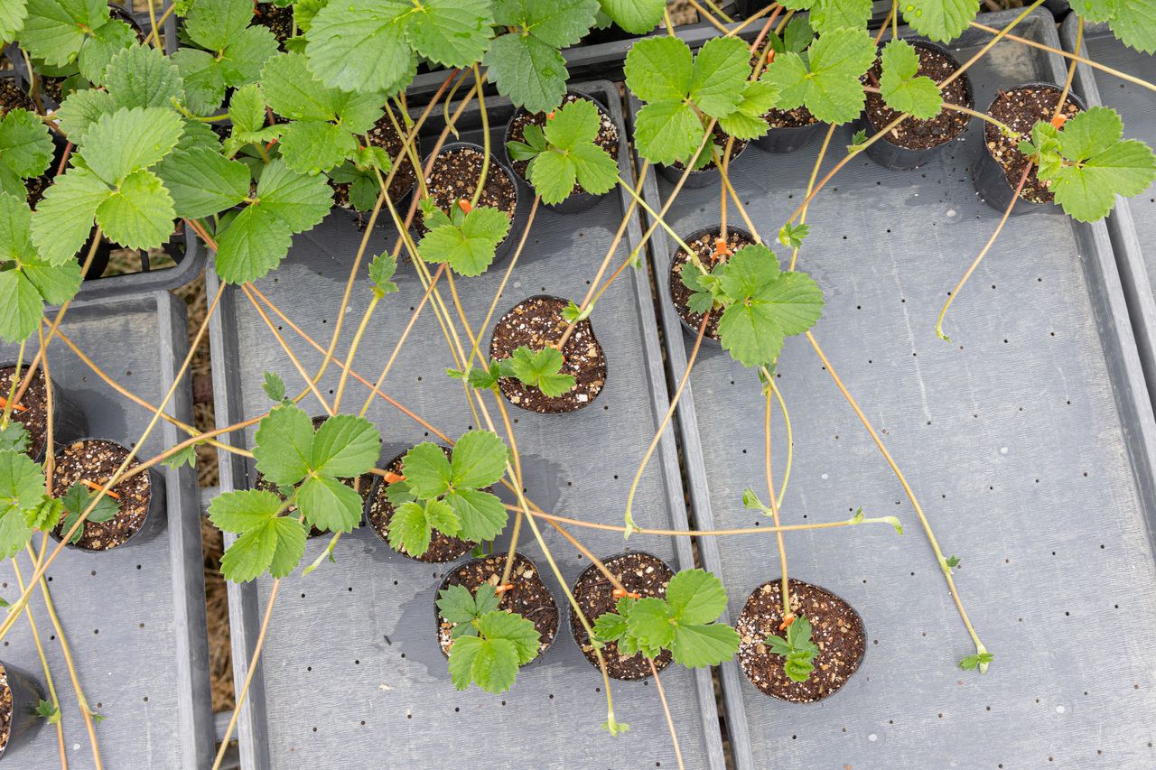 次のシーズン用のイチゴのランナーをのばします。ランナーの先に新しい苗がついたら、切り取ってポットやトレイに挿していきます。